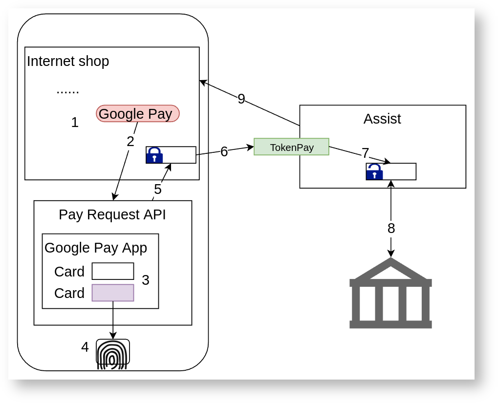 - Google Pay app creates an encrypted package with a token and payment data and returns it to online store page script.