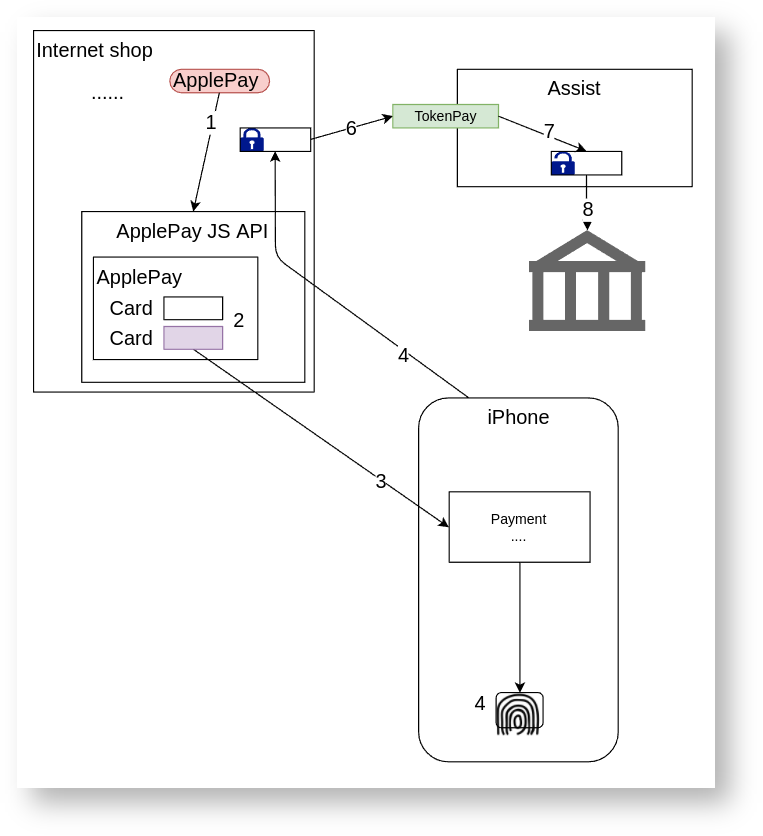 - Apple Pay app creates an encrypted package with a token and payment data and returns it to online store page script.
