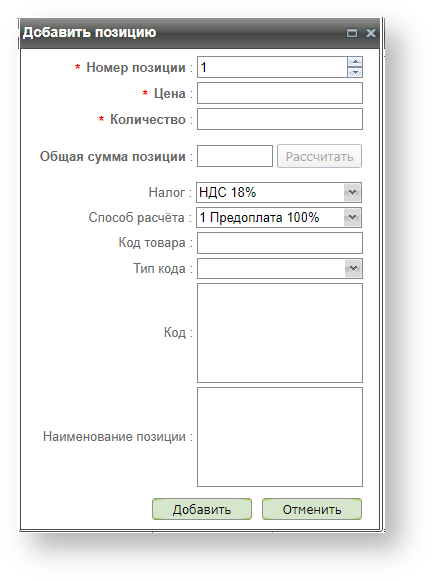 Нажатие кнопки «Добавить» открывает окно для заполнения полей параметров позиции.