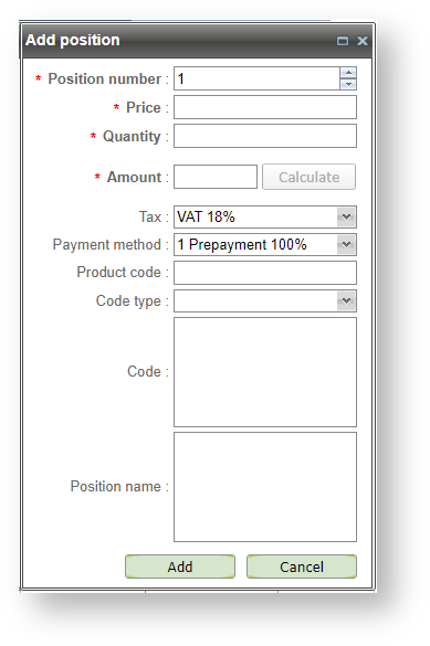 If the merchant works with the transfer of the cheque, then it is possible to specify the items of the cheque and their parameters during preparing the payment. Click the "Edit" button in the "Order data" section to change cheque items. If the "Edit" button is inactive, then the merchant does not work with the cheque. To activate this function, contact the support service of the IPS Assist. After clicking the "Edit" button, a new "Receipt positions" window will open.