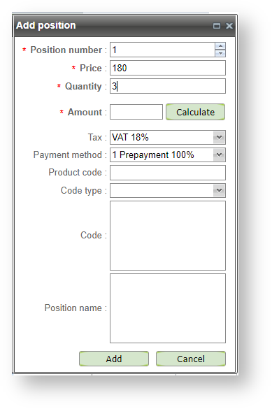 After filling the "Price" and "Quantity" fields, the "Calculate" button becomes active. Pressing this button automatically fills the "Amount" field with the calculated value (Price*Quantity).