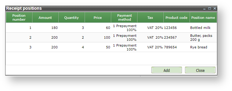 After adding the next bill item, all items will be displayed as a table in the "Receipt positions" window.