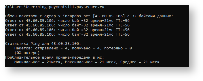 Для проверки целостности и качества соединения с сервером payments111.paysecure.ru используется команда в командной строке (cmd):
