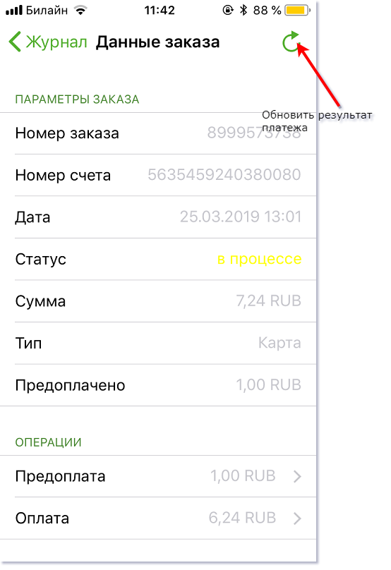 Если проведенный платеж имеет статус «В процессе», можно повторно запросить результат платежа: