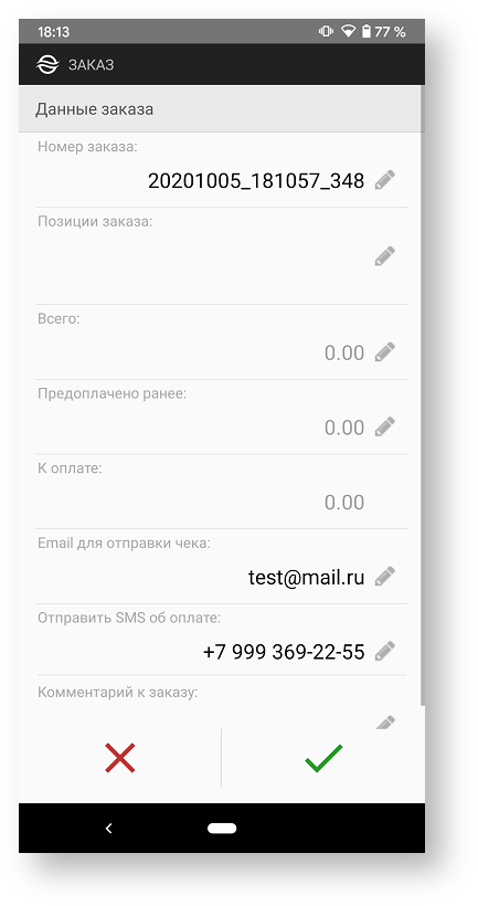 Если номер заказа введен правильно, то полученные от информационной системы компании-продавца или курьерской службы данные заказа - Email адрес покупателя, его телефон и список оплачиваемых товаров отобразятся на экране приложения: