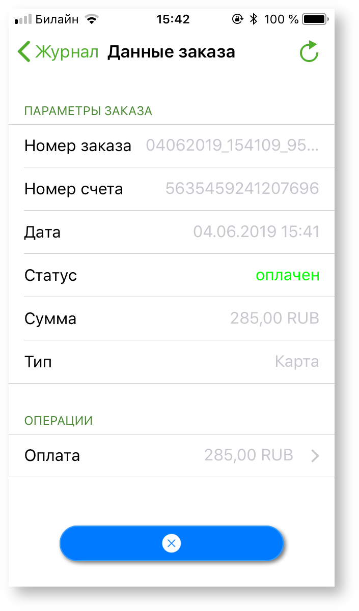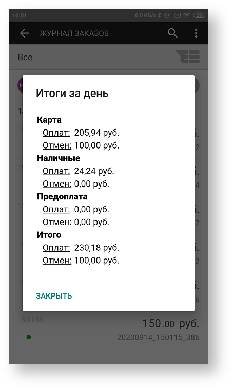 В журнале заказов можно в любой момент просмотреть результат работы приложения mPOS за текущий день. Для просмотра итогов следует нажать кнопку «Итог», после чего откроется новой окно