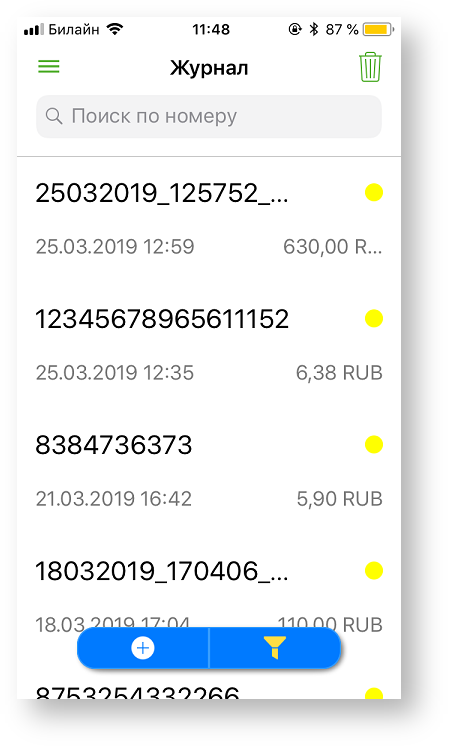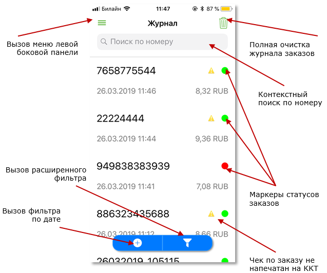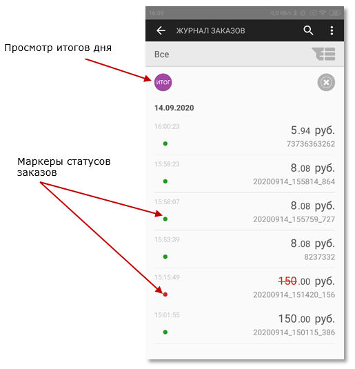 Успешно оплаченные заказы, по которым был сформирован фискальный чек, дополнительно помечаются специальным маркером желтого цвета.