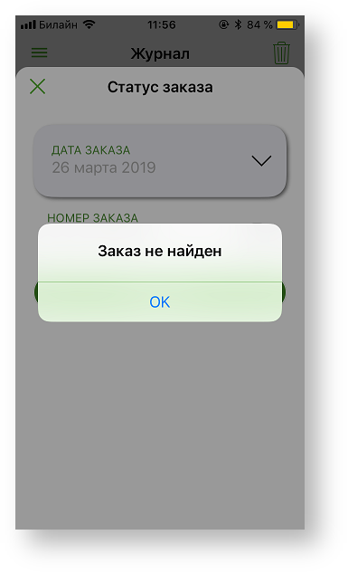 Если в журнале заказов отсутствует запись, соответствующая заданному фильтру, то на экране отображается следующее сообщение: