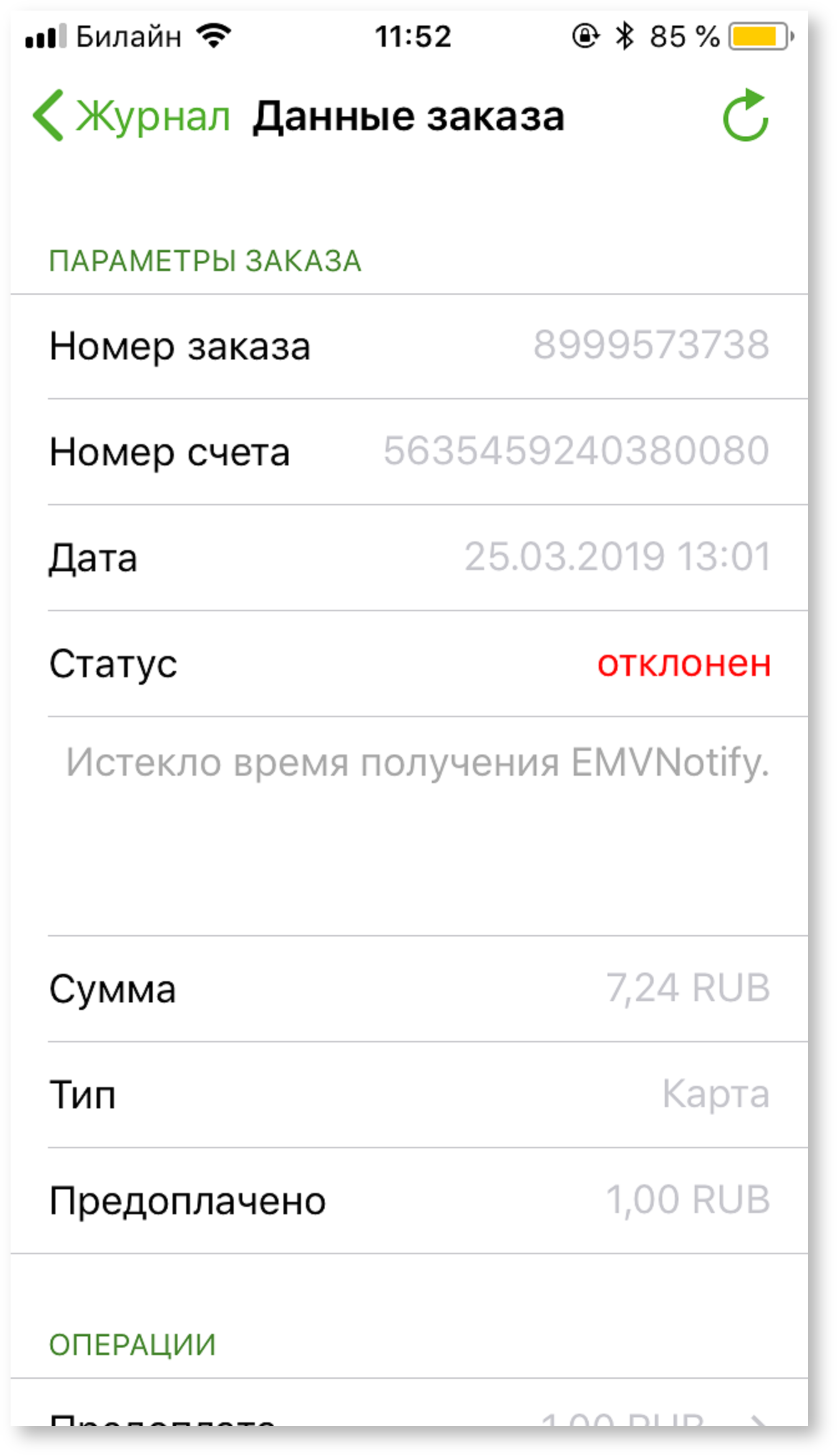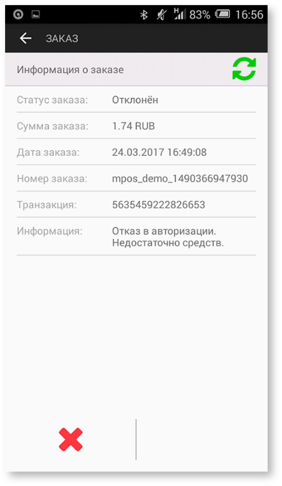 Внешний вид успешной и неуспешной транзакций при детальном просмотре в журнале заказов: