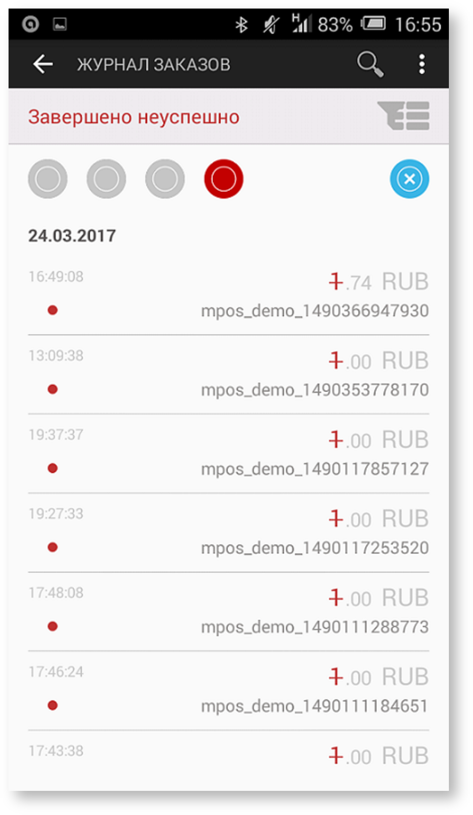 - красный - неуспешная оплата по заказу (платеж отклонен);