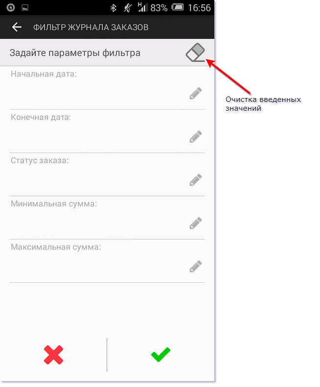 Кнопка «» подтверждает выбор записей в журнале заказов в соответствии с настроенными фильтрами. Кнопка «Х» отменяет выбор записей согласно настроенным фильтрам и возвращает к отображению всех записей журнала заказов.