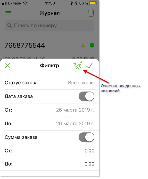 Для возврата к отображению журнала заказов без фильтров следует нажать голубую кнопку снятия фильтров, расположенную в правой части экрана.