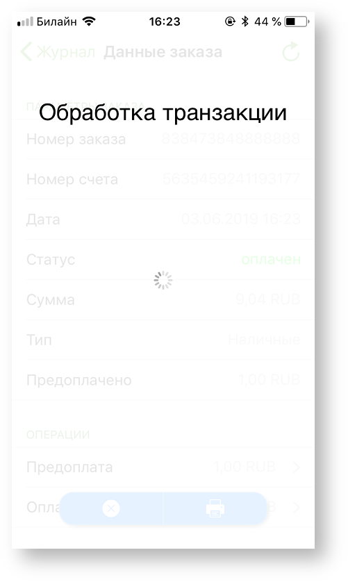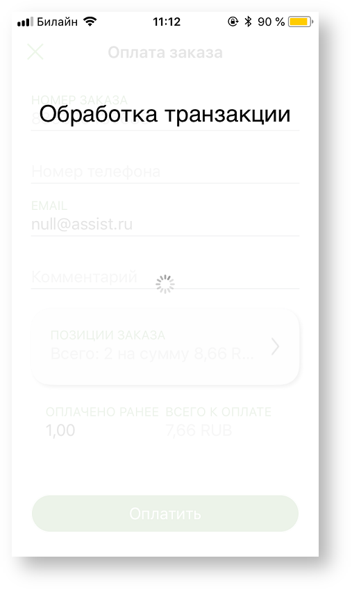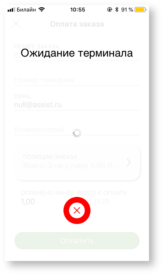 В этот момент пользователь может прервать процесс оплаты, нажав специальную кнопку Х, после чего выполняется возврат на страницу данных заказа.