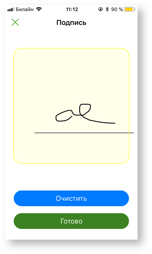 Кнопка «Готово» подтверждает ввод подписи на экране. Кнопка отмены ввода подписи «X» отменяет оплату заказа.