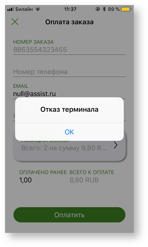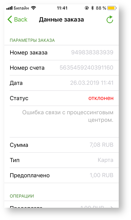 Далее открывается результирующий экран платежа, в котором указана причина неуспешной авторизации: