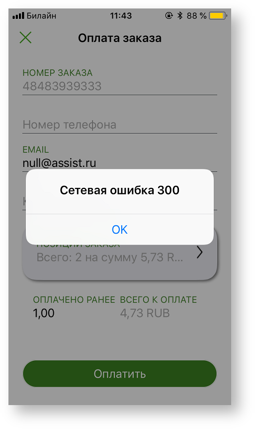 Если выполнена повторная попытка оплаты заказа, то возможно появление следующего сообщения:
