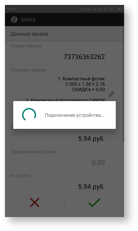При выборе способа оплаты картой процесс оплаты заказа начинается с организации соединения с беспроводным терминалом: