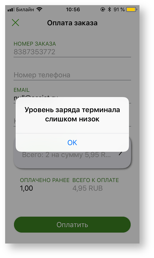 При недостаточном заряде батареи беспроводного терминала в приложении Assist mPOS выводится соответствующее сообщение: