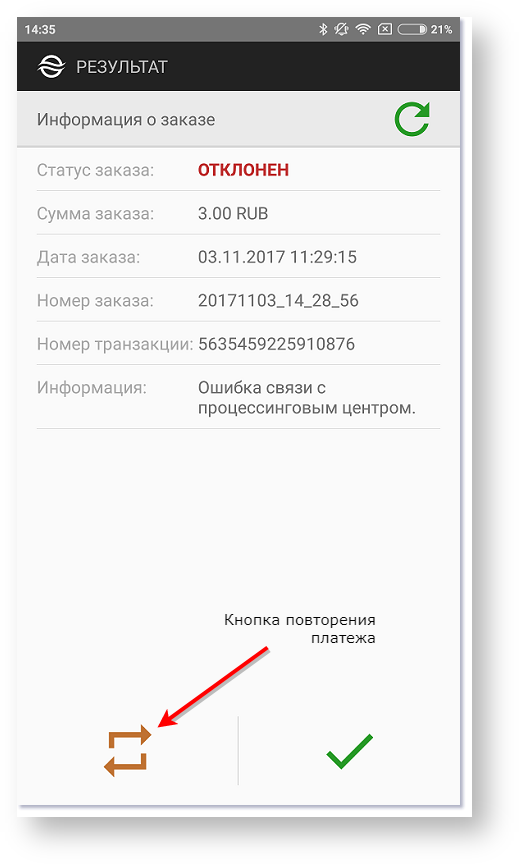 Кнопка «» осуществляет возврат к первому экрану приложения (или в приложение предприятия). С помощью специальной кнопки можно повторить попытку платежа (например, после пополнения карты).