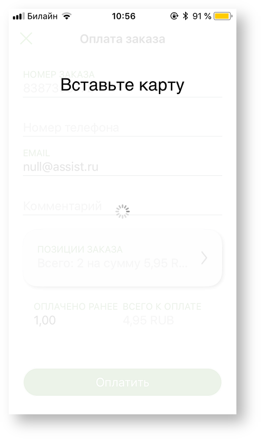 Далее покупателю предлагается вставить карту в беспроводной терминал (терминал принимает данные карты с помощью одного из возможных способов - NFC, чип, магнитная полоса):