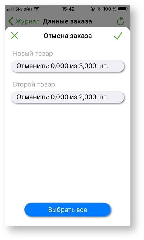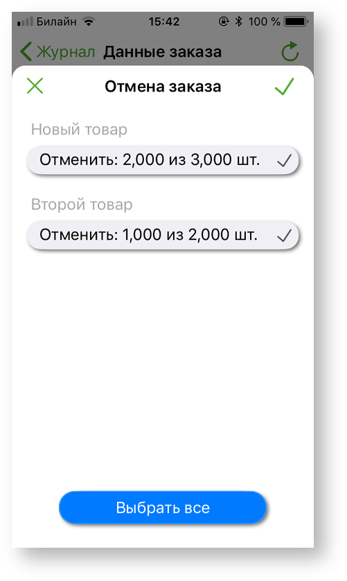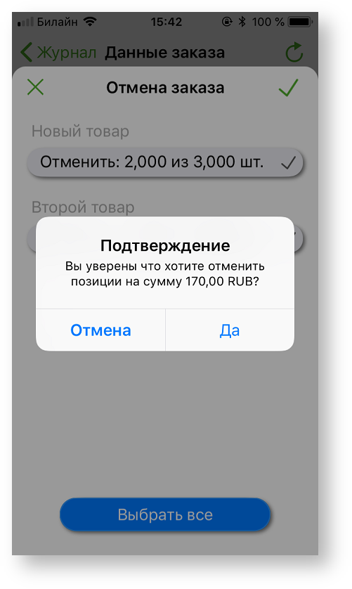 Отмена выбранного заказа осуществляется после нажатия кнопки отмены, расположенной в левой нижней части экрана. Далее пользователю предлагается список позиций заказа для выбора отменяемых позиций. В каждой отменяемой позиции можно указать количество товара для отмены в этой позиции. Для полной отмены заказа можно воспользоваться кнопкой «Выбрать все».