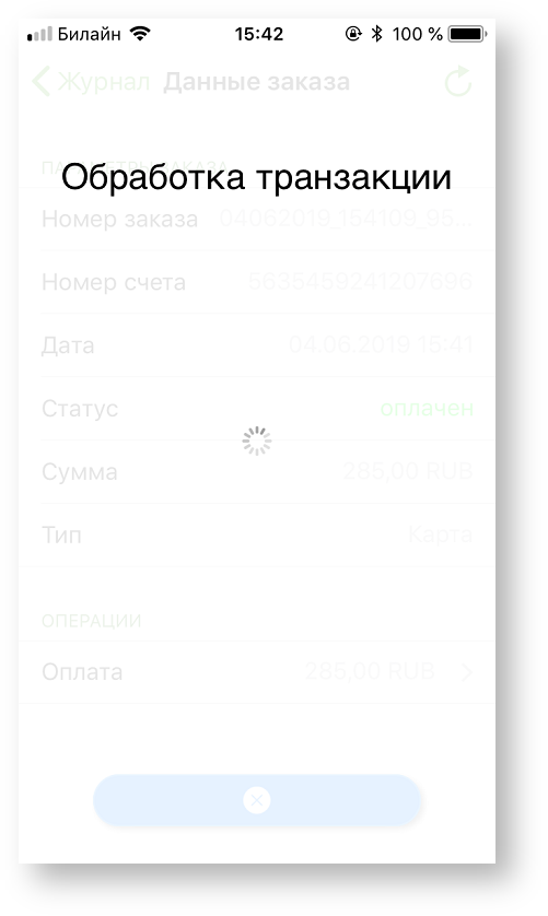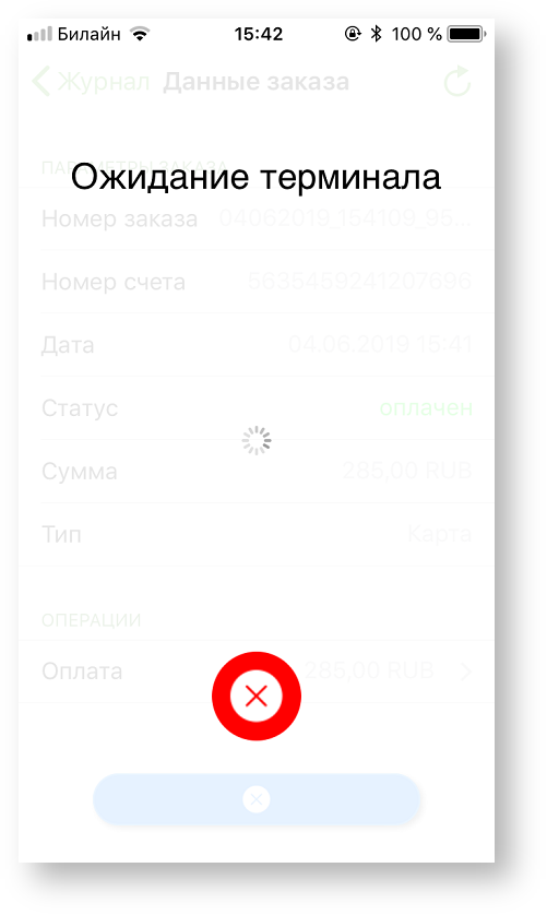 Отмена платежа начинается с ожидания терминала. В этот момент пользователь может прервать процесс отмены, нажав специальную кнопку X