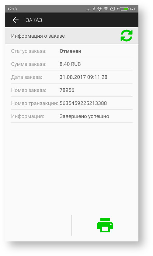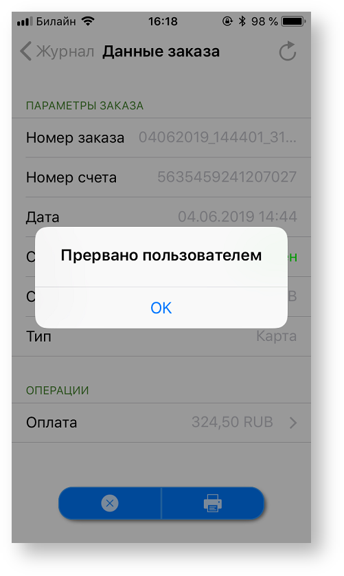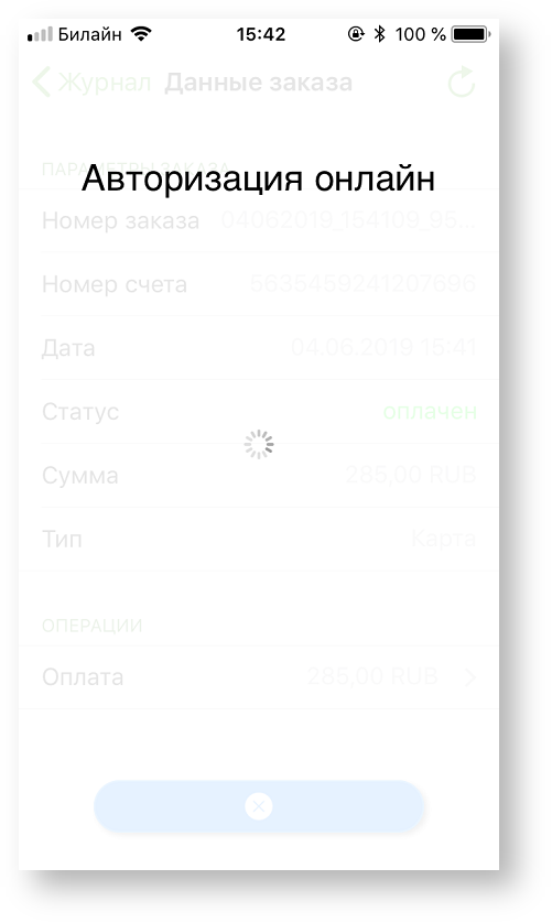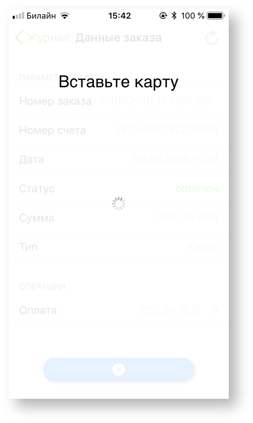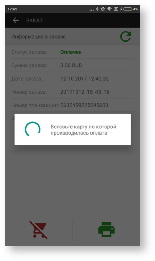Если заказ был оплачен картой, то для подтверждения отмены покупателю предлагается вставить карту в беспроводной терминал (терминал принимает данные карты с помощью одного из возможных способов - NFC, чип, магнитная полоса):