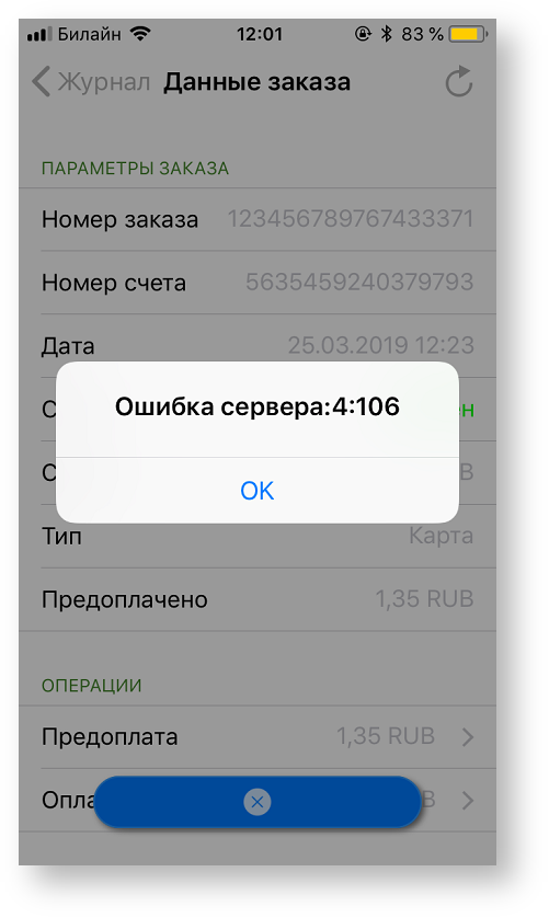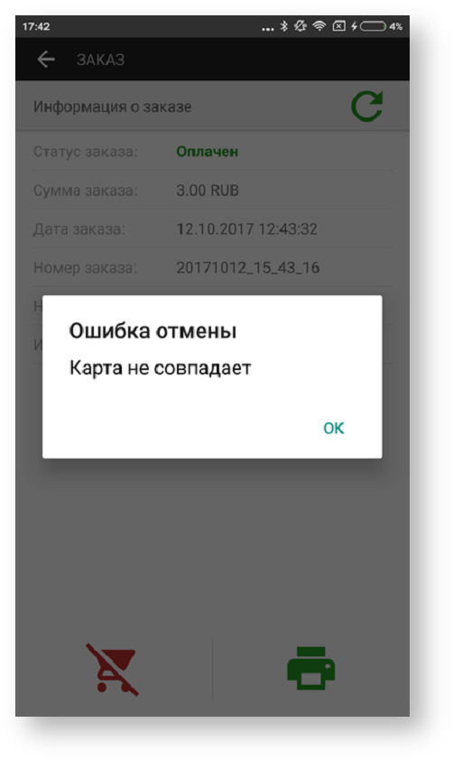 Если предъявленная карта не совпадает с картой, с помощью которой была произведена оплата, то на экране отобразится сообщение об ошибке.