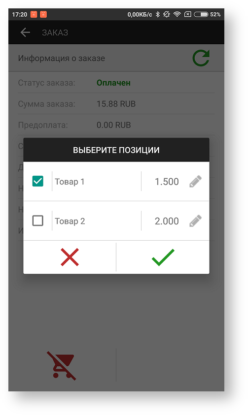 После нажатия кнопки отмены пользователю предлагается список позиций заказа для выбора тех из них, которые необходимо отменить.