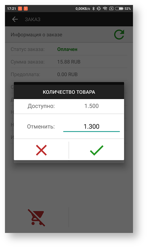 Далее для отменяемой позиции можно указать количество товара для отмены в этой позиции: