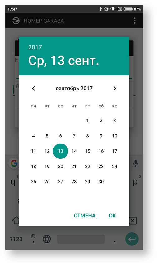 Ввод даты заказа можно осуществить с помощью встроенного календаря.