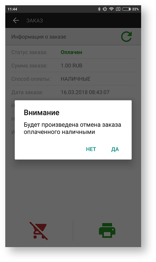 Такой заказ также может быть отменен, при этом запрашивается дополнительное подтверждение отмены заказа, оплаченного наличными.