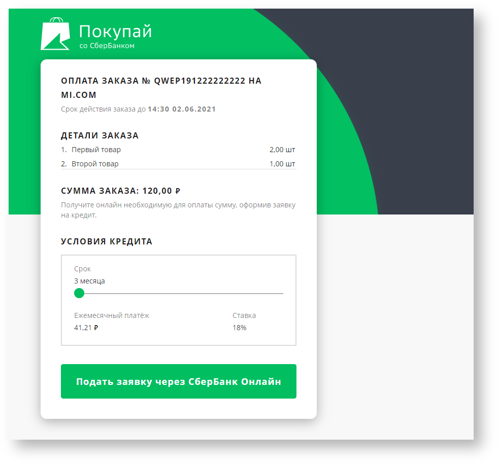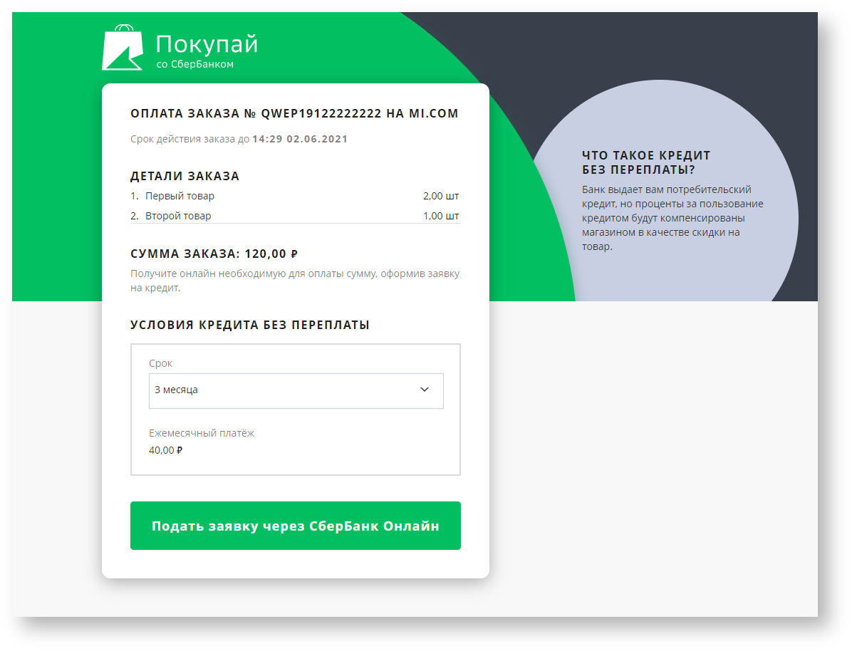 Здесь покупатель оформляет заявку на получение кредита или рассрочки через Сбербанк Онлайн. При этом покупатель может выбрать срок кредита или рассрочки, после чего на экране отображается ежемесячный платеж при возвращении кредита.