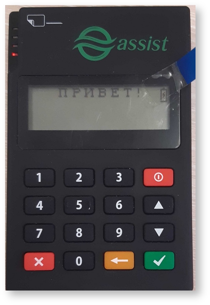 Включение беспроводного терминала осуществляется с помощью нажатия и удерживания кнопки включения, при этом загорается синий светодиод. На экране включенного беспроводного терминала отображается приветствие.