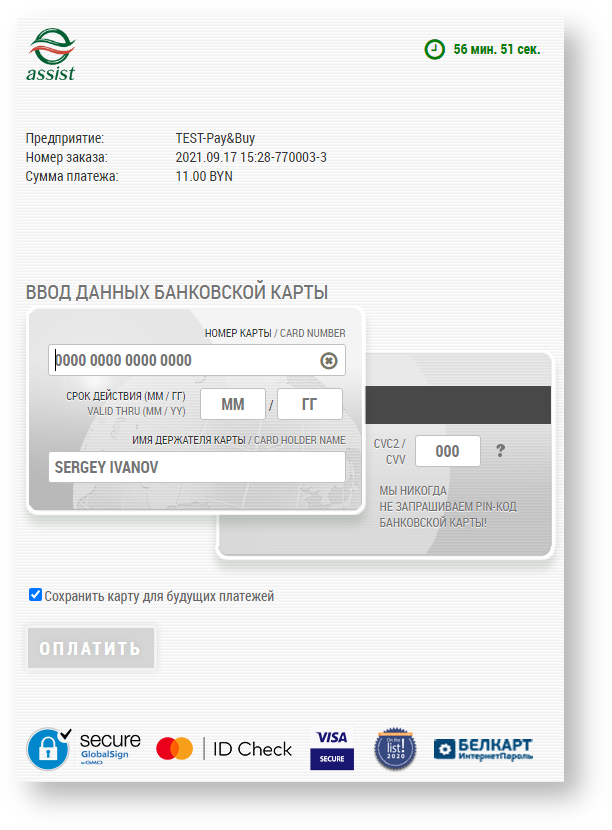 При оплате очередного заказа клиент получает предложение сохранить карту для будущих платежей, если число его успешных покупок (включая текущую) на данном предприятии с помощью одной и той же банковской карты достигло заданного в настройках значения. Текст предложения располагается в нижней части экрана: