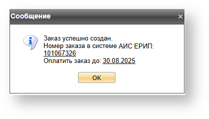 Окно результата успешного создания заказа в системе АИС ЕРИП
