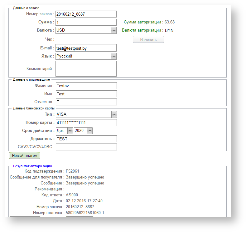 - если нужно провести платеж для того же мерчанта и такого же режима оплаты, то следует нажать на кнопку «Новый платеж», тогда все поля экранной формы очистятся и можно вносить данные нового платежа;