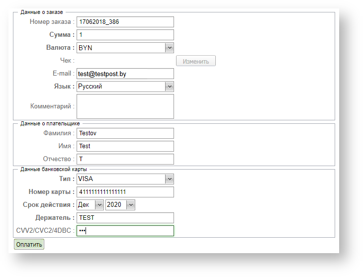 4.Теперь необходимо заполнить поля экранной формы для проведения платежа. Подтверждение внесенных данных осуществляется с помощью кнопки «Оплатить».