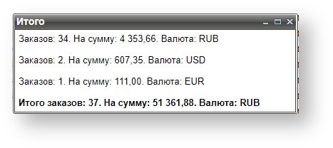 Нажатие кнопки отображает в дополнительном окне итоги по каждой валюте, в которой производилась оплата заказов с указанием количества заказов в данной валюте, а также общий итог в рублях.