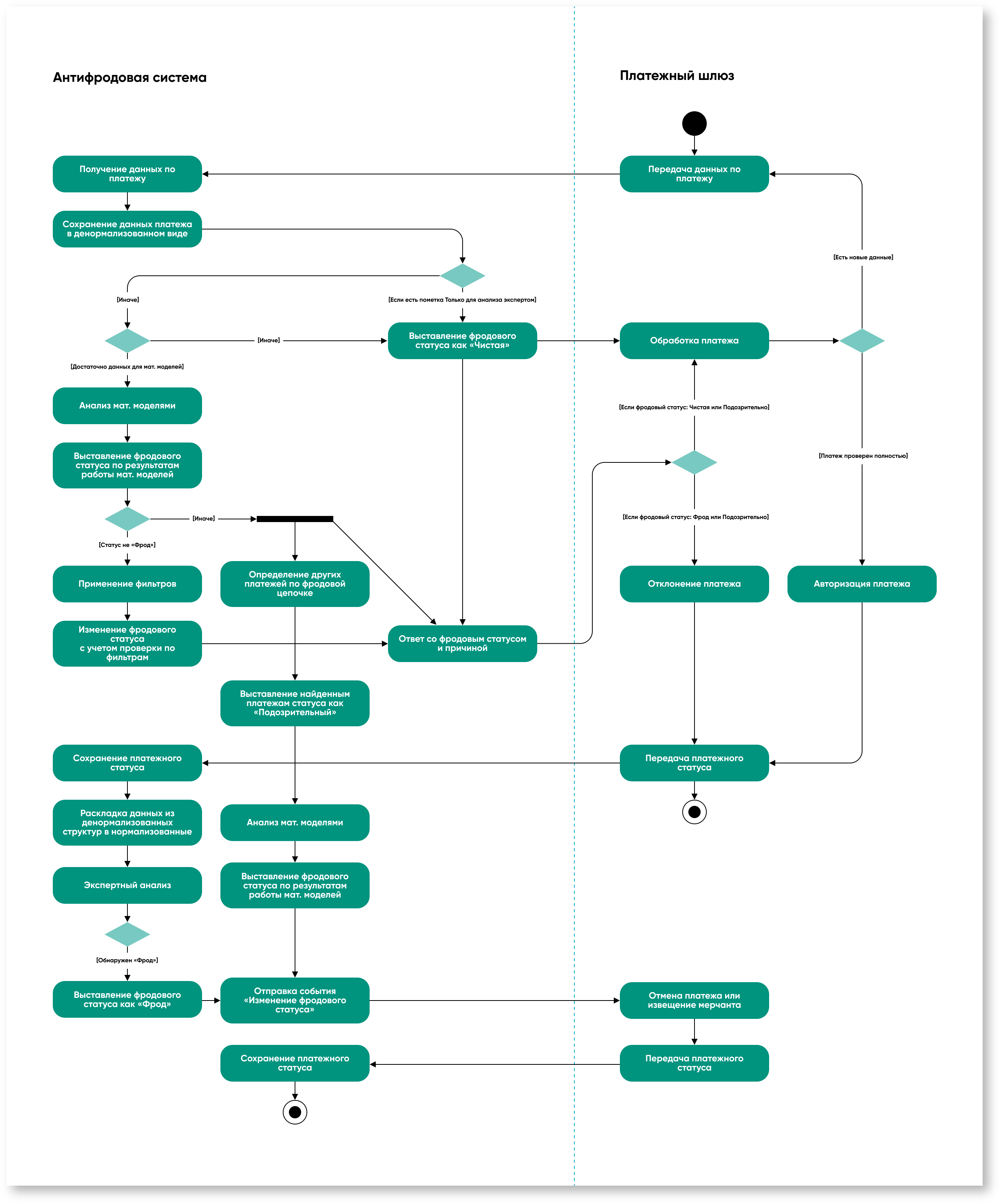 • по результатам анализа СПМ выставляет фрод-статус платежной операции и передает его внешней системе вместе с причиной выставления;
