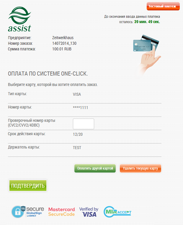 Если клиент соглашается стать участником программы One Click, то для совершения следующего платежа ему будет предложено ввести лишь код CVC2, все остальные параметры пластиковой карты будут заполняться автоматически. Если же этот платеж будет неуспешным, то при следующей покупке опять появится предложение об участии в программе. Разумеется, что из соображений безопасности номер карты отображается на экране с помощью маски. Все дальнейшие платежи этого клиента могут осуществляться по этой схеме. Записи с его номером (CustomerNumber) присваивается статус «Участник».