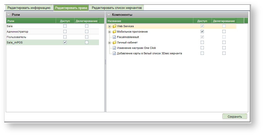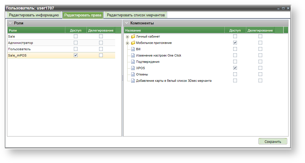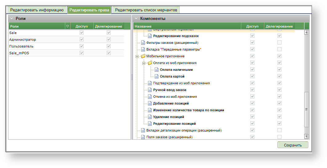 • в открывшемся окне редактирования прав в разделе «Роли» необходимо поставить галочку в колонке «Роли» напротив пункта «Sale_mPOS»;
