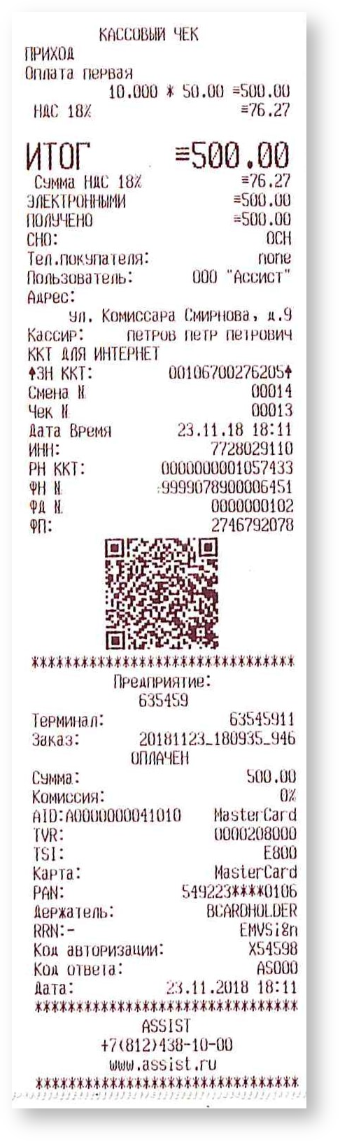 Ниже представлен внешний вид чека, напечатанного фискальным принтером после успешного платежа.