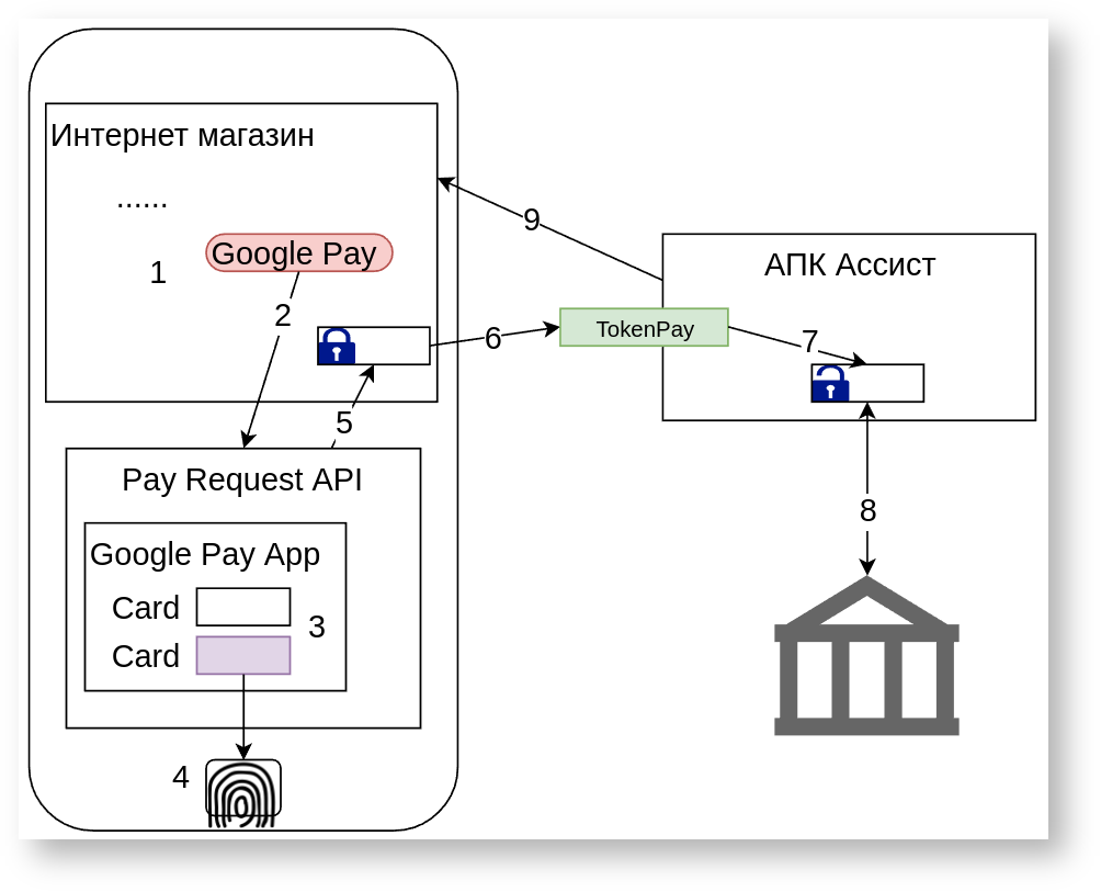 - Приложение Google Pay формирует зашифрованный пакет с токеном и данными платежа и возвращает его скрипту страницы магазина.