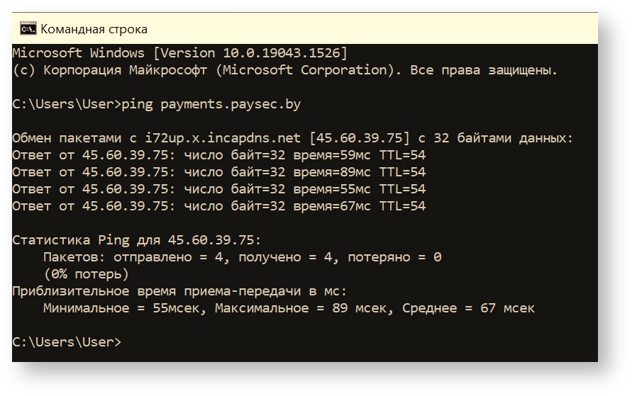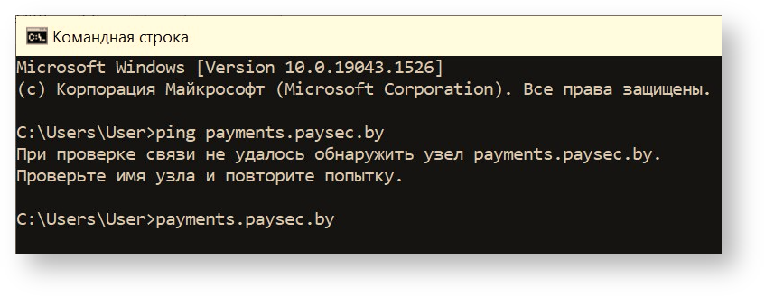 Для проверки целостности и качества соединения с сервером payments.paysec.by используется команда в командной строке (cmd):