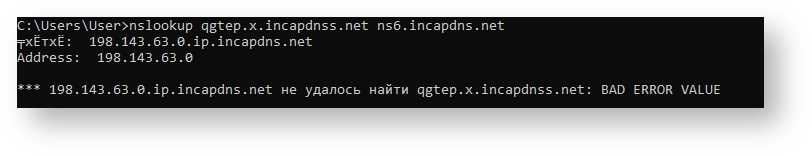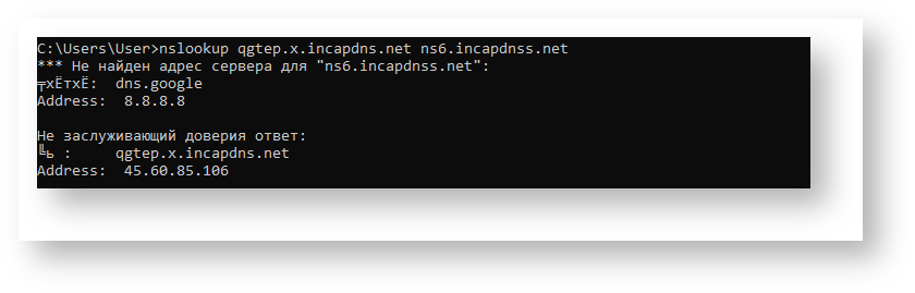 Для диагностики службы DNS, проверки DNS записей сервера qgtep.x.incapdns.net (имя сервера может быть иным, см. результат предыдущей команды) через DNS запись ns6.incapdns.net используется команда в командной строке (cmd):