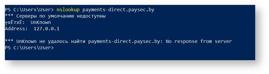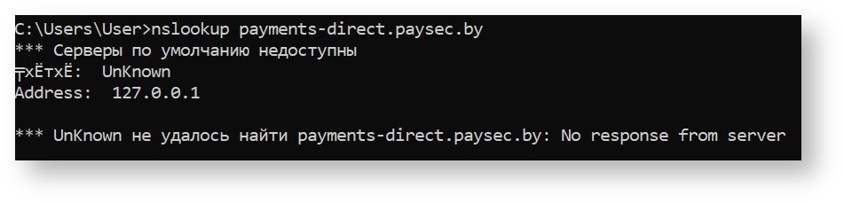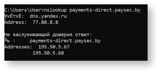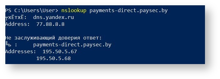 Для диагностики службы DNS, проверки DNS записей сервера payments-direct.paysec.by и обнаружения проблем, связанных с разрешением имен в системе DNS используется команда в командной строке (cmd):