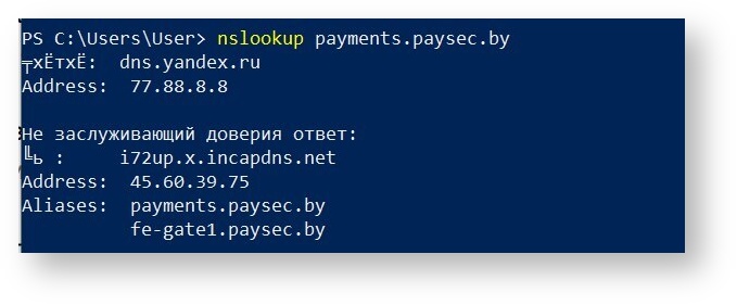 Для диагностики службы DNS, проверки DNS записей сервера payments.paysec.by используется команда в командной строке (cmd):