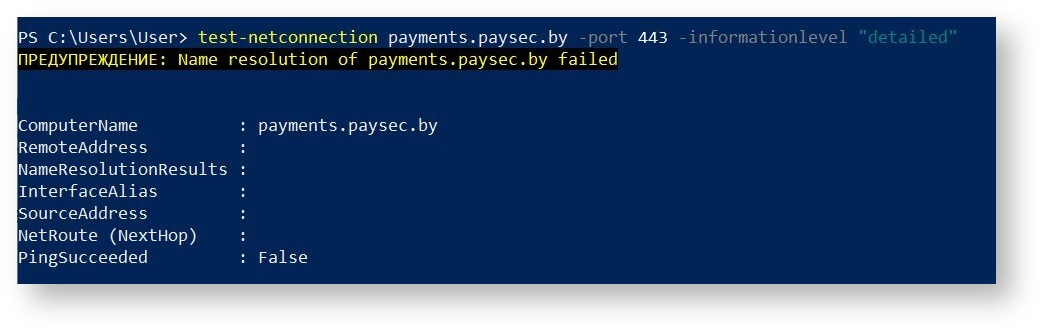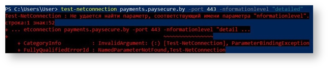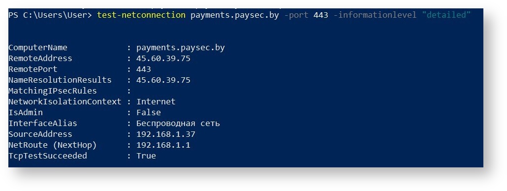 Для проверки доступности 443 порта (HTTPS) сервера payments.paysec.by из сети пользователя применяется команда в Powershell: