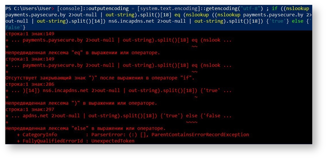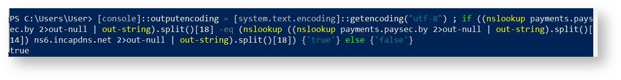 [console]::outputencoding = [system.text.encoding]::getencoding("utf-8") ; if ((nslookup payments.paysec.by 2>out-null | out-string).split()[18] -eq (nslookup ((nslookup payments.paysec.by 2>out-null | out-string).split()[14]) ns6.incapdns.net 2>out-null | out-string).split()[18]) {'true'} else {'false'}